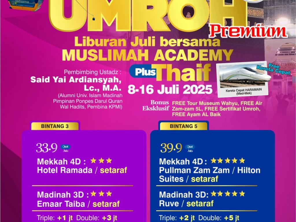 Paket Premium Bintang 5 Muslimah Academy Start Jakarta, 9 hari, by Saudia Airline (8 Juli) [Clone UMR000099]