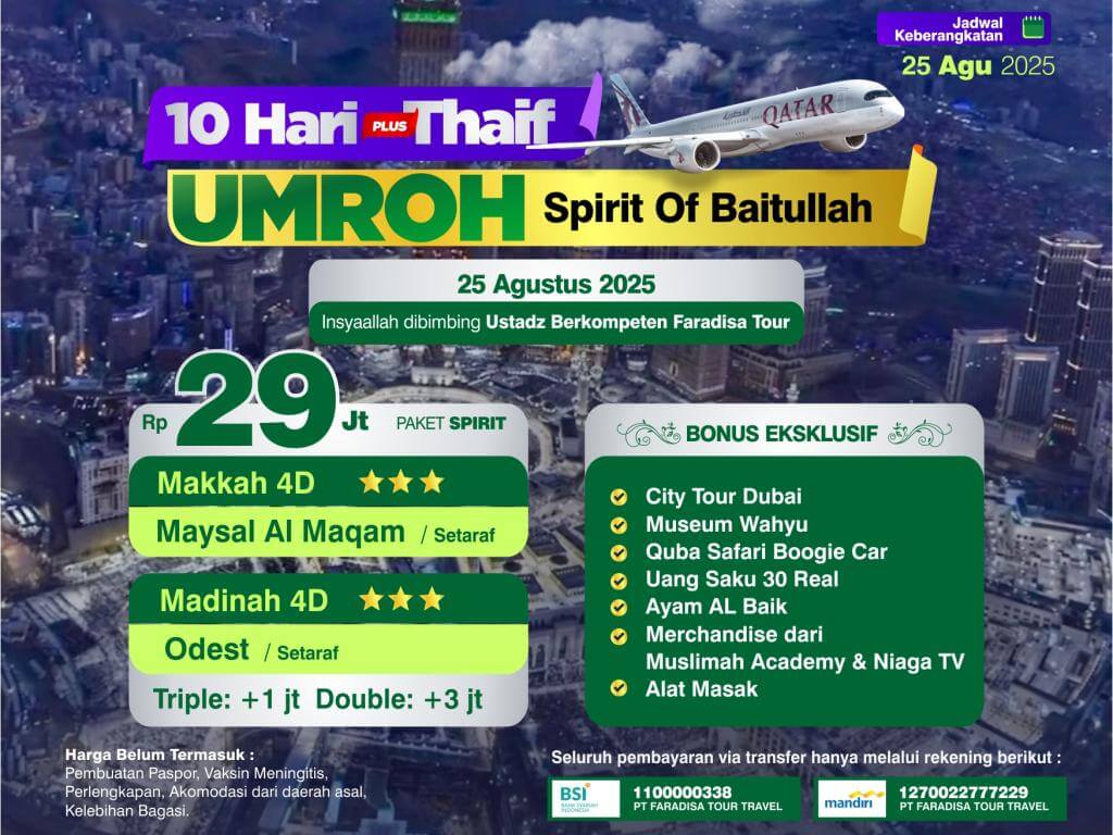 Paket Spirit Umroh Plus Thoif, Start Jakarta, 10 hari, by Qatar (25 Agustus 2025)